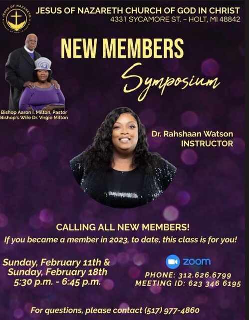 Sunday, February 25, 2024 @ 4 pm Black History Program at Jesus of Nazareth COGIC MARCH Saturday, March 2, 2024 – 33nd Ministers and Workers Meeting Musical Tuesday, March 5, 2024 @ 6pm via Zoom -Youth Dept. Resurrection Service Rehearsal Thursday, March 7, 2024 – 33nd Ministers and Workers Meeting – Tuesday, March 12, 2024 @ 6pm via Zoom -Youth Dept. Resurrection Service Rehearsal Friday, March 8 2024- 33nd Ministers and Workers Meeting – Saturday, March 9, 2024 – 33nd Ministers and Workers Meeting – Wednesday, March 14, 2024 L.C. Hunter Memorial District & Thursday, March 15, 2024 Saturday, March 23, 2023 Music Dept President Appreciation Day @ 5pm Saturday, March 30, 2024 @ 12noon (in person) -Youth Dept. Resurrection Service Rehearsal Sunday, March 31, 2024 Easter Sunday/ Nazareth Resurrection Sunday Program (after service) APRIL Sunday, April 7, 2024 Bishop’s Wife Mother Virgie Milton (Appreciation Day) @ 3:30 pm April 8-12, 2024- Annual Spring Call Meeting/General Assembly, Memphis, TN Thursday, April 18, 2024 Central District Meeting & Friday, April 19, 2024 Central District Meeting Saturday, April 27, 2024 @ 9:30 am – 3:30 pm (Seminar) MAY Wednesday, May 1, 2024 Majestic District & Thursday, May 2, 2024 Majestic District Saturday, May 4, 2024, Bishop’s State Day District Meeting Service at 1 pm - Juris Headquarters May 7-9, 2024 - National Men’s Conference Wednesday, May 8, 2024 Celestial District & Thursday, May 9, 2024 Celestial District Friday, May 10, 2024 Celestial District Saturday, May 18, 2024 @1 pm. (Nazareth Tent Revival) May 27-31, 2024- International Women’s Convention, Orlando, FL Thursday, May 30, 2024 – Jurisdictional Supervisor Mother Mary J. Walton’s birthday JUNE Wednesday, June 5, 2024 Brotherly Love District & Thursday, June 6, 2024 Brotherly Love District Friday, June 7, 2024 Brotherly Love District Sunday, June 9, 2024 @ 4pm Pastoral Anniversary /Supt Gene & Lady Linda Buggs Thursday, June 13, 2024 Jurisdictional Auxiliaries in Ministries (AIM) Convention Friday, June 14, 2024, Jurisdictional Auxiliaries in Ministries (AIM) Convention Saturday, June 15, 2024 Jurisdictional Auxiliaries in Ministries (AIM) Convention Friday, June 21, 2024 Tyler Memorial District & Saturday, June 22, 2024 Tyler Memorial District June 24-28, 2024 - National AIM (Auxiliaries in Ministry), St. Louis, MO Saturday, June 29, 2024 – Bishop Aaron I. Milton’s birthday Sunday, June 30, 2024 Central District Family & Friends Day at 4pm at the Jesus of Nazareth COGIC JULY Thursday, July 4--Independence Day Saturday, July 6, 2024 City of Refuge District Saturday, July 6, 2024 Taylor & Vinny wedding