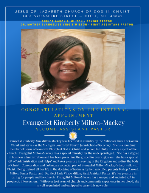 In my conclusion, it should be recognized that on Friday, March 8, 2019 yet another historic moment in time occurred when the highest ranking officials in the National Church of God in Christ traveled from around the world to witness the unprecedented ceremony of our leaders. Bishop Aaron Isaiah Milton was consecrated by the Church of God in Christ, Inc., Chief Apostle Charles E. Blake Sr., Presiding Prelate. He has now been serving as the official Jurisdictional Prelate of Southwest Michigan 4th Ecclesiastical Jurisdiction for (4) years, right alongside his warrior beautiful wife Mother Virgie Milton. The divinity of the number four is structure, planning, organization, rules, and order. As they celebrate (40) years in ministry and the (4th) year in the Bishopric. Look for them both to walk circumspectly and flow in their governmental anointing.